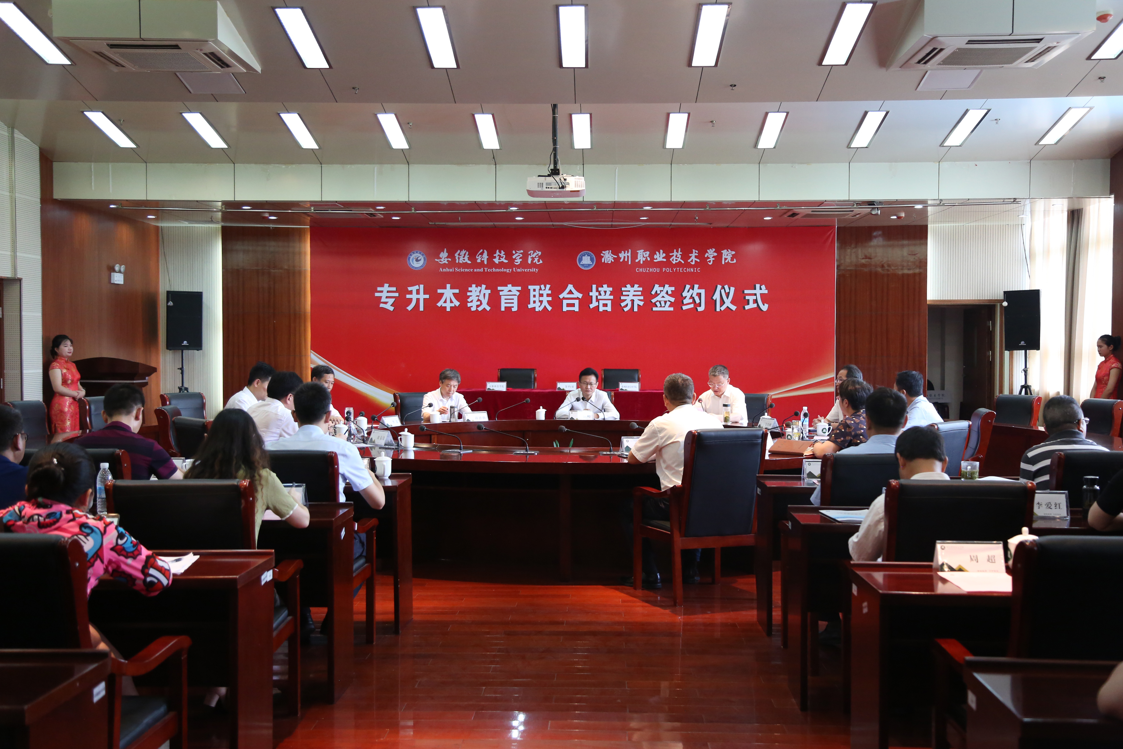 7月21日,安徽科技学院与437必赢会员中心专升本教育联合培养签约仪式在综合楼1102会议室隆重举行。滁州市政府副市长陆峰,安徽科技学院党委书记蒋德勤,党委副书记、校长李震,党委委员、纪委书记、监察专员王强,党委委员、副校长黄友锐,437必赢会员中心党委书记曹付忠,党委副书记、校长许雪峰,党委副书记杨家庆,党委委员、副校长江洁,党委委员、校长助理、招生就业处处长穆松及两校相关职能部门和二级学院负责人参加了签约仪式。会议由江洁主持。