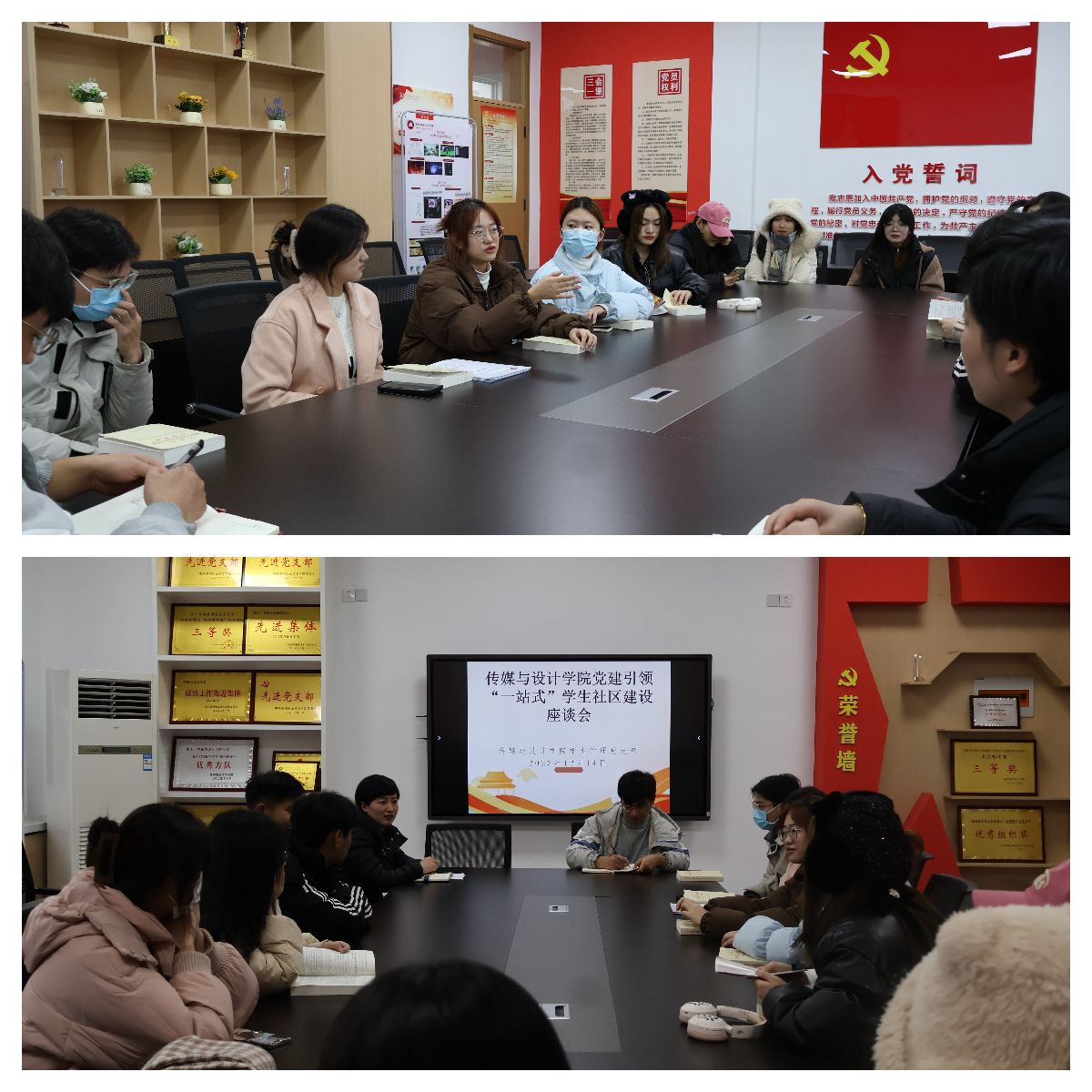 12月14日下午,传媒与设计学院学生管理党支部在德馨楼302会议室组织召开党建引领“一站式”学生社区建设座谈会,党支部书记刘娟、组织委员吴涛、党员代表、学生干部代表、入党积极分子代表参加了座谈会。在座谈会上,与会成员围绕“党建引领‘一站式’社区建设”展开研讨。师生们认为,学院可以在推进理论学习系统化系列化、组织社区志愿服务活动、开展多样化红色思政活动、深入开展学业帮扶活动、加强“一站式”社区的宣传等方面扎实推进“一站式”社区建设,并对目前生活、学习中常见的问题进行了梳理。刘娟在总结发言时表示,学院“一站式”社区围绕立德树人根本任务,以党建为引领,依托社区平台,院领导、辅导员、专任教师加强协同育人,有利于用“浸润式教育”将思政文化育人工作做到“家”,打通育人最后一公里。