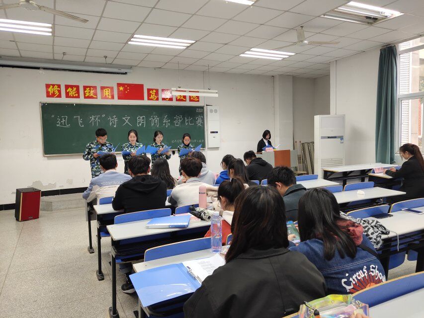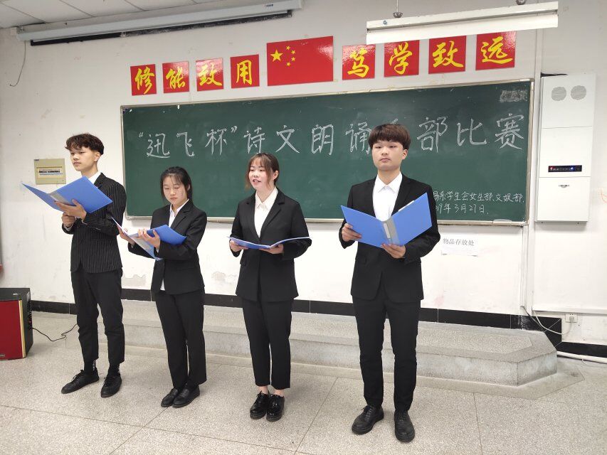 伴随着舒缓的音乐,朗诵比赛拉开了帷幕。选手们一个个盛装上台,或婉转、或昂扬,有的回忆着对新中国先烈的慷慨缅怀,有的满怀激情地述说着美好的青春,有的深情款款地回忆着那曾经的美好。《满江红》、《致橡树》、《相信未来》等诗文朗诵出了青春的美好;《走向远方》、《面朝大海,春暖花开》等诗文则朗诵出了大家脑海中对这些经典诗文的感怀;除此之外,此次活动形式多样,有爱国题材的《怎能没有你-可爱的祖国》,还有多人朗诵《我的南方和北方》,而散文《背影》更是博得了现场观众的掌声。