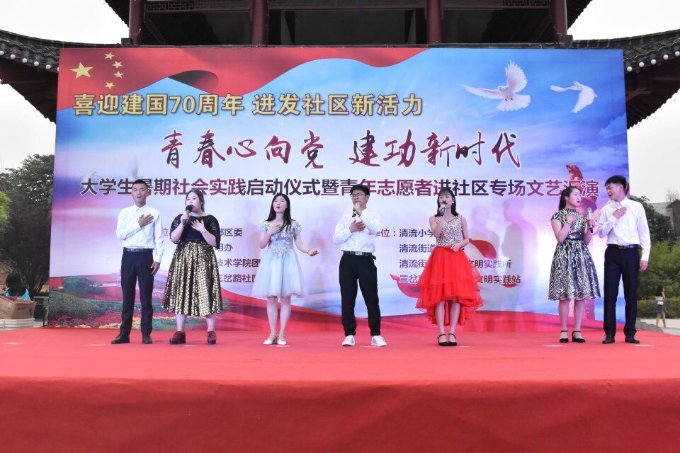 此次仪式首先老师就本次活动的主题、活动内容、实践形势等作出了精彩的致词。接着是暑期社会实践授旗仪式,传承延续暑期社会实践锻炼精神,大学生暑期社会实践活动是围绕人才培养而开展的一项有影响的活动,是我们青年学生受教育、长才干、做贡献的主要渠道之一。他们号召参加社会实践的同学们积极走进实践活动,主动在社会中寻求自身责任感,磨练自我意志,丰富社会实践经验。力争圆满完成各项实践任务,以优异的成绩向学校汇报,最后进行了文艺汇演。