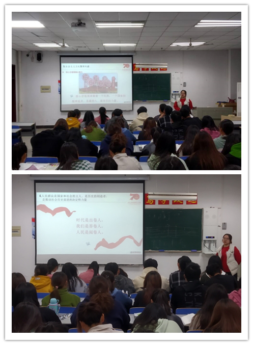 主题团课以精美的课件为载体,分为艰辛探索,铸就辉煌历程;砥砺奋进,谱写壮丽史诗;深刻启示,引领前行之路三个部分,结合具体的事例向同学们阐述了新中国成立七十年的光辉历程:经济建设创造了“中国奇迹”,政治发展道路越走越宽广,社会主义文化繁荣兴盛,百姓有更多获得感,生态文明建设进入快车道。在全体同学齐声背诵社会主义核心价值观时,再一次振奋了同学们的精神,激发了他们的爱国情感和使命。