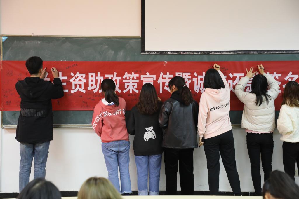 活动中,杜昌天就助学贷款的性质为大家进行了详细讲解,为确保国家政策顺利实施让每一位贫困的大学生都享有资助政策,各班成立了贫困评议小组,杜绝掺杂个人感情进行评选,必须要做到公开公正公开,让真正贫困的同学得到相应的资助。杜昌天还提到大学生贷款要诚信还款,并安排同学们有序在横幅上签字,最后全体同学合影留念。