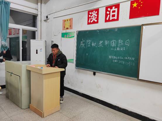 为了让同学们深刻了解到奴隶制带来的危害及世界上穷人们想要废除奴隶制的心理。12月8日计应一班团支书蔡思雨带领全班同学,开展废除奴隶制国际日主题团日活动。