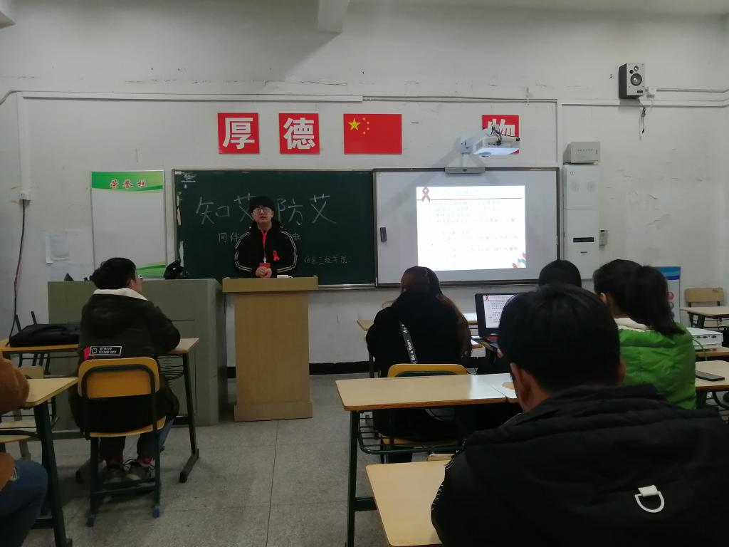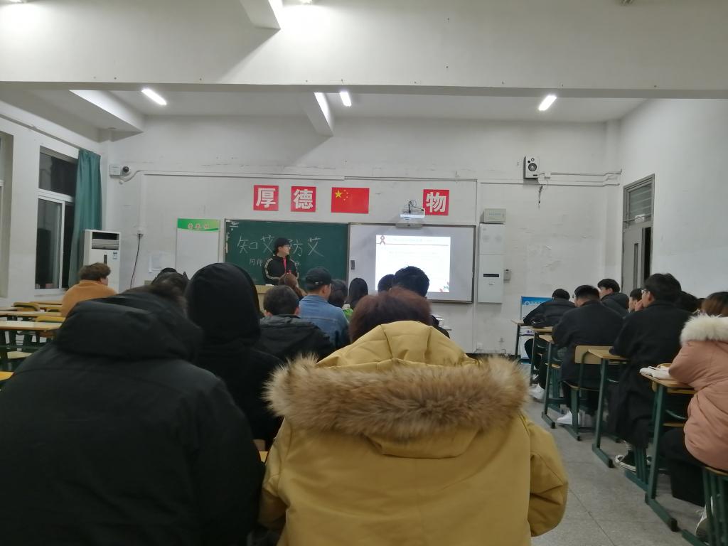 活动开始前,团总支副书记刘畅组织干事为大家发放了艾滋病胸标,点明此次活动的主题。活动中,由19级团支部书记钱召阳主持,以PPT的方式为大家讲解了艾滋病的主要内容,用真实的案列、大量的数据、图片和现场演示讲解出何为艾滋,怎样预防艾滋,让同学们更加深入的了解艾滋病,并意识到预防艾滋的重要性。