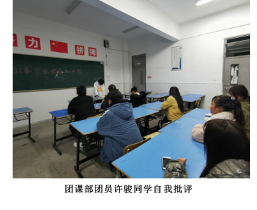 首先,孙明慧让在场所有团员团干汇报近期思想状况,随后,大家围绕“勇于自我批评,争做团员先锋”议题展开思考,并就此展开深刻的发言。团员许骏同学作为第一个发言人,就自身在日常团总支工作、专业课程学习、生活方面做出了自我剖析与自我评价,接着,在场团员团干依次对他进行了点评,就存在的一些缺点问题当面指正,提出建议。团员宋先德同学,就自己及身边同学朋友的生活实际与自身的烦恼困扰做出了深刻的自我剖析与自我批评,得到了团员团干们的共鸣。接下来,在场的每位团员团干都在发言中不断反思总结自己,并虚心接受他人的批评与建议。