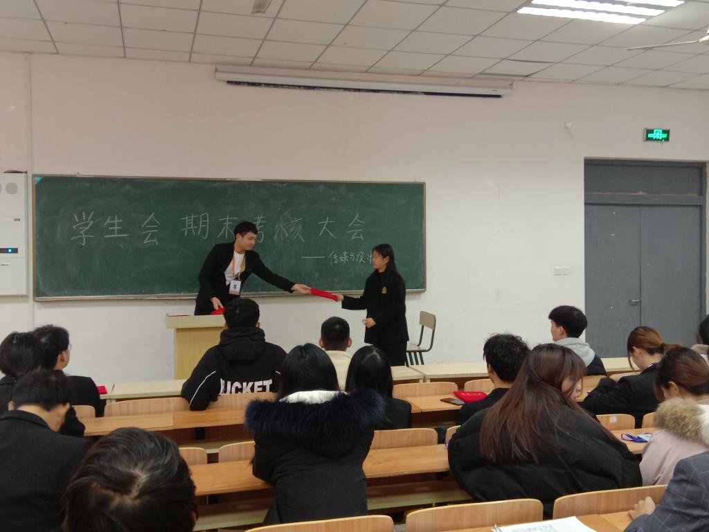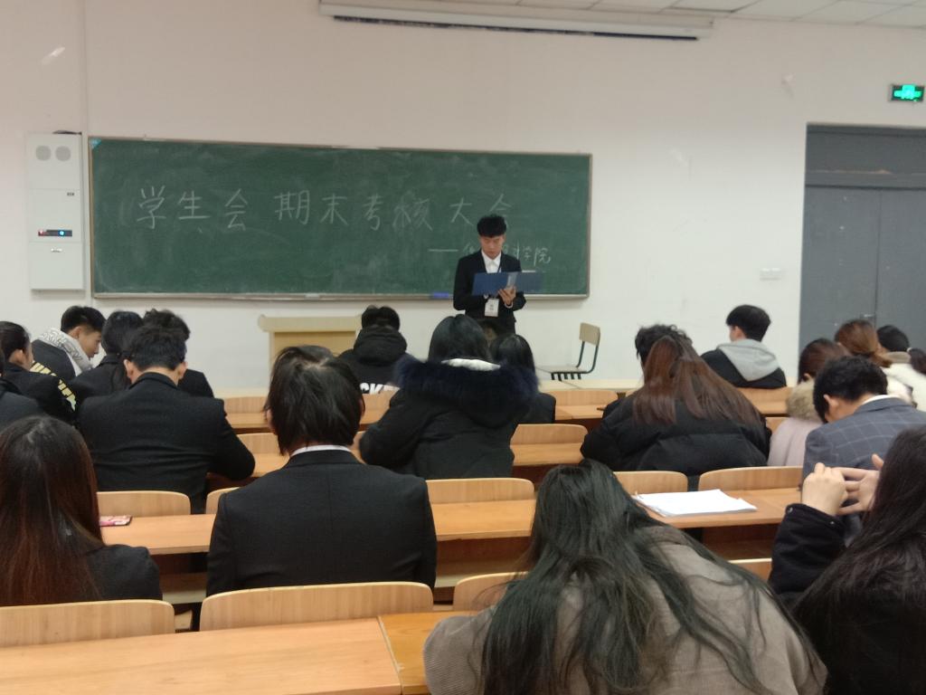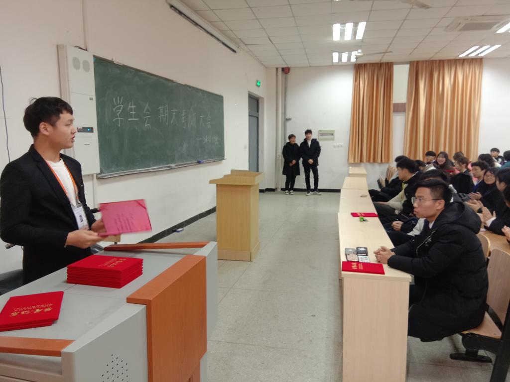 会议开始,学生会各部门代表上台陈述本学期的部门工作。之后,学生会主席徐志强总结本学期工作,并对干事表示感谢和鼓励,以及对下学期的工作进行规划。一学期的工作即将结束,对于优秀的干事、干部进行表彰并颁发荣誉证书。