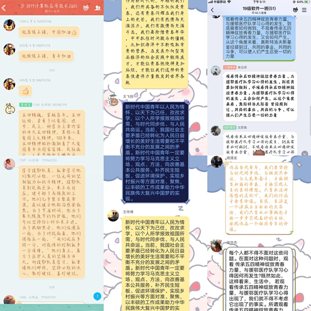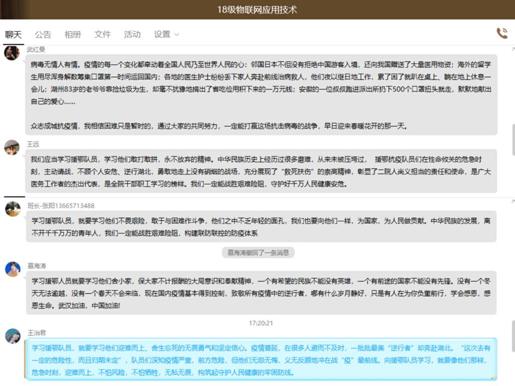 直播结束之后,各班级团支书在班级群里发起讨论,同学们通过此次直播更加深刻的了解到了医护人员在抗疫工作中的辛苦:每天穿上防护设备进入隔离区,至少六个小时不能喝水也不能去厕所,有时候呼吸都很困难,会流很多汗也会错过吃饭时间,长时间戴着口罩和护目镜,脸上会留下深深浅浅的伤口……这些辛苦和困难都不可能让他们退缩,反而更加坚定了他们和疫情抗争到底的决心,他们将医者精神诠释到了极致。同学们在各自班级群中热情积极地分享着自己感想及对抗疫英雄的敬畏之情。