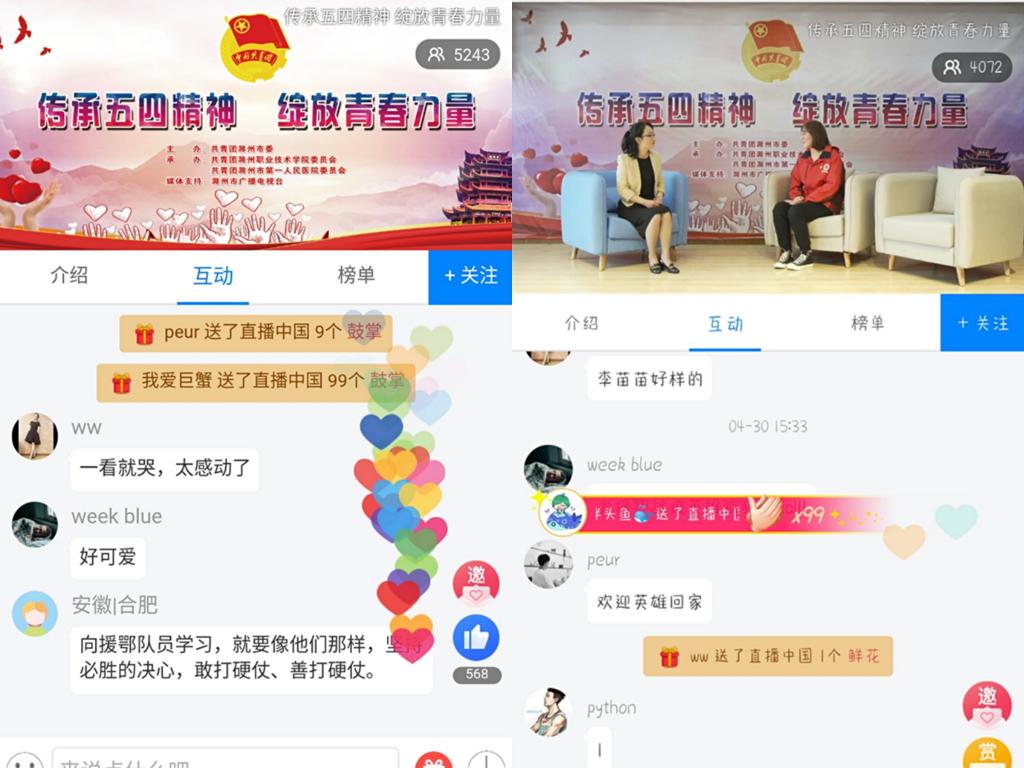 本次采访的是我市第一批支援湖北医疗队队员李苗苗和王吉文。直播过程中,李苗苗讲述了自己与医疗团队之间的事迹以及其他岗位对医护人员的关心,希望青少年不负青春、不负未来。王吉文是一名“95后”护士,也是援鄂医疗救护队中年龄最小的成员,他分享了自己在武汉重症监护室工作的感想,尤其对于亲人离别的场面感同身受。同时,他还在直播中完成了自己的一个愿望:重温并宣读入团誓词。
