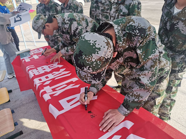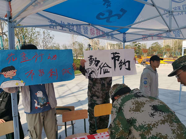 我院团学干部到达军训场地后,首先向我院20级新生进行“厉行节约、反对浪费”主题宣传教育,希望大家养成节约粮食的品质,倡导节约文明。接着所有团学青年在横幅上签字承诺,从自身做起,以实际行动制止餐饮浪费行为,做“文明就餐、拒绝浪费”的宣传者和践行者。