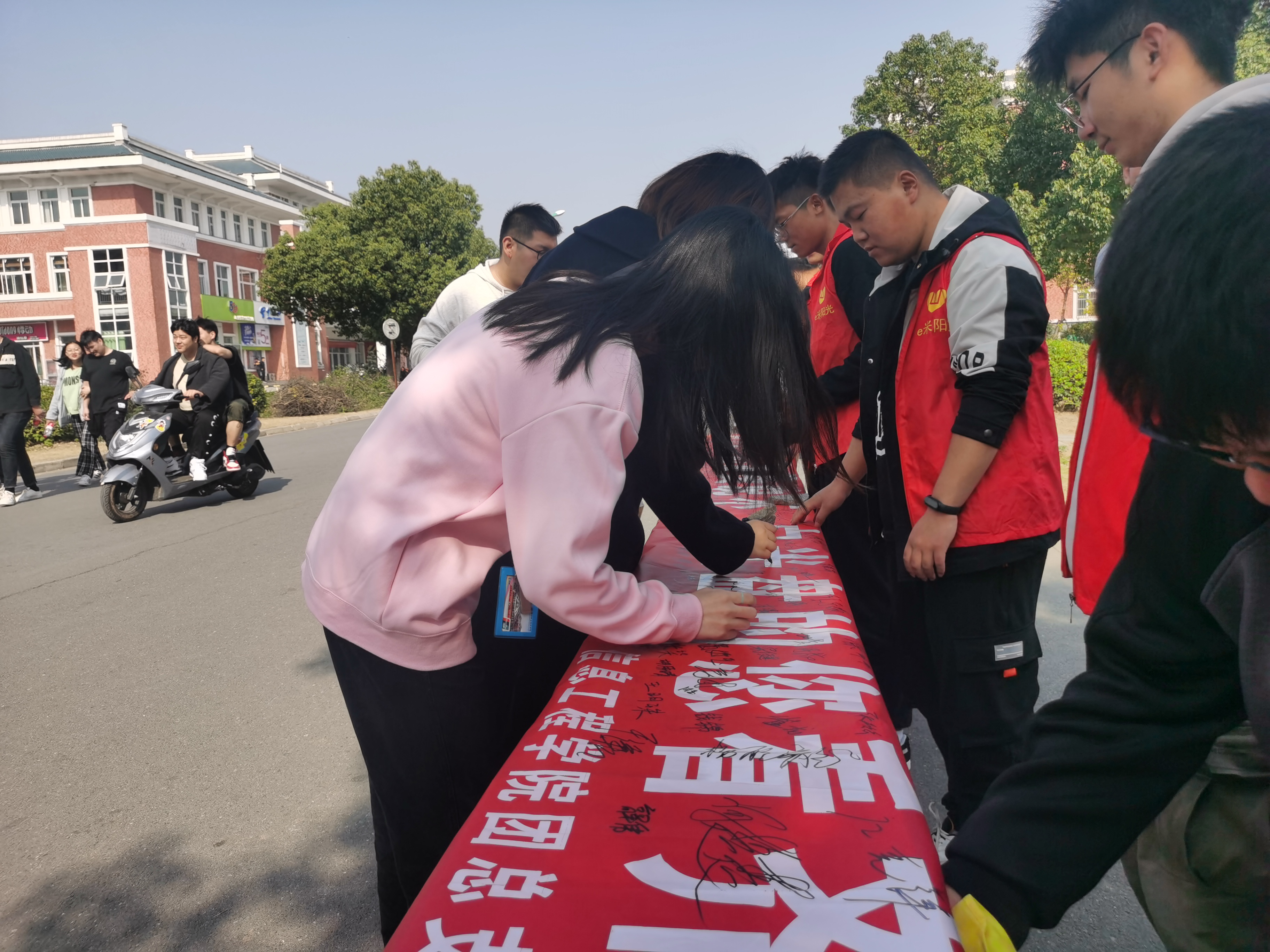 厉行节约,反对浪费,光盘行动,从我做起,是我们每一位新时代的青年应尽的责任和义务,志愿者们反复宣读“向舌尖上的浪费说不,向光盘行动的您看齐”的口号,引导经过食堂就餐的同学们积极在横幅上签下自己的名字,让“舌尖”节俭成为“心间”美德,以实际行为引领校园节约新风尚。
