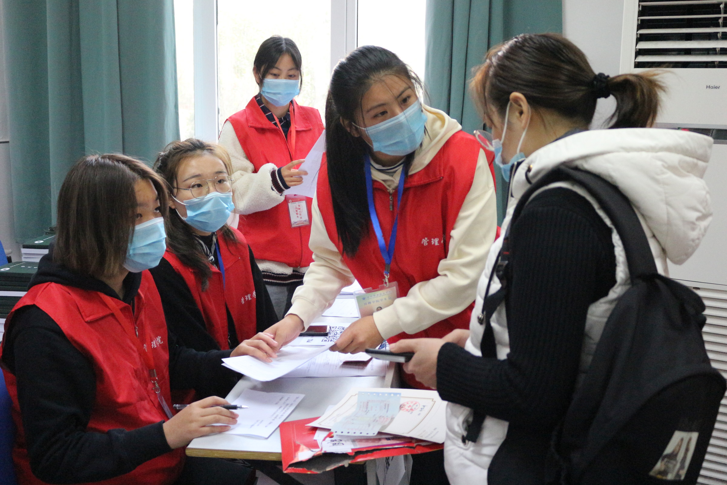 一早,迎新现场各项工作早已布置妥当,学院的迎新工作人员也已各就各位,等待各位新生到来。热心的志愿者们佩戴工作牌,个个精神饱满。在志愿者的引导下,各位社招新生有条不紊的办理入学手续,为新生和提供全方位的服务。新生报道期间,管理学院老师也来到现场看望慰问迎新工作人员和服务的志愿者们,了解迎新工作的进展,迎新工作一直在有序的进行。