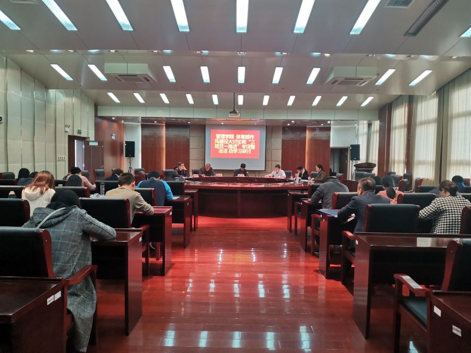 11月18日下午,管理学院、体育部全体同志在和正楼1102会议室召开作风建设大讨论和“三规范一推进”专项整治活动学习研讨。校党委委员、副校长江洁出席会议。会议由管理学院党总支副书记耿学刚主持。