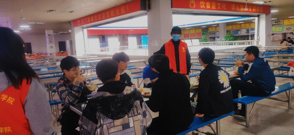 活动开始,由班级团支书向在食堂就餐的同学们宣传如何做好防疫工作并劝说同学们分散就餐,就餐中不交流、少说话,避免交叉感染。通过在校园内给未佩戴口罩的同学们分发口罩来告诉同学们戴口罩的重要性,保护了自己的同时也保护了他人。同时,班级团支书和组织委员告诉同学们疫情期间需适当的开窗通风,保持室内空气流通,降低室内空气中微生物的数量与密度,减少人与病原体接触的机会。