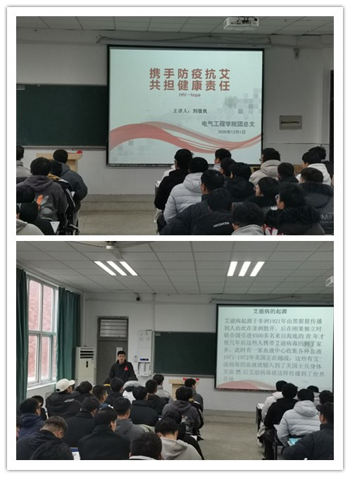 为加强预防艾滋病知识的宣传,增强学生的自我保护意识,了解艾滋病的传播途径,正确对待艾滋病。电气工程学院团总支于12月1日中午在5102教室开展了“携手防疫抗艾,共担健康责任”主题宣传活动,大一各班级学生代表积极参加。