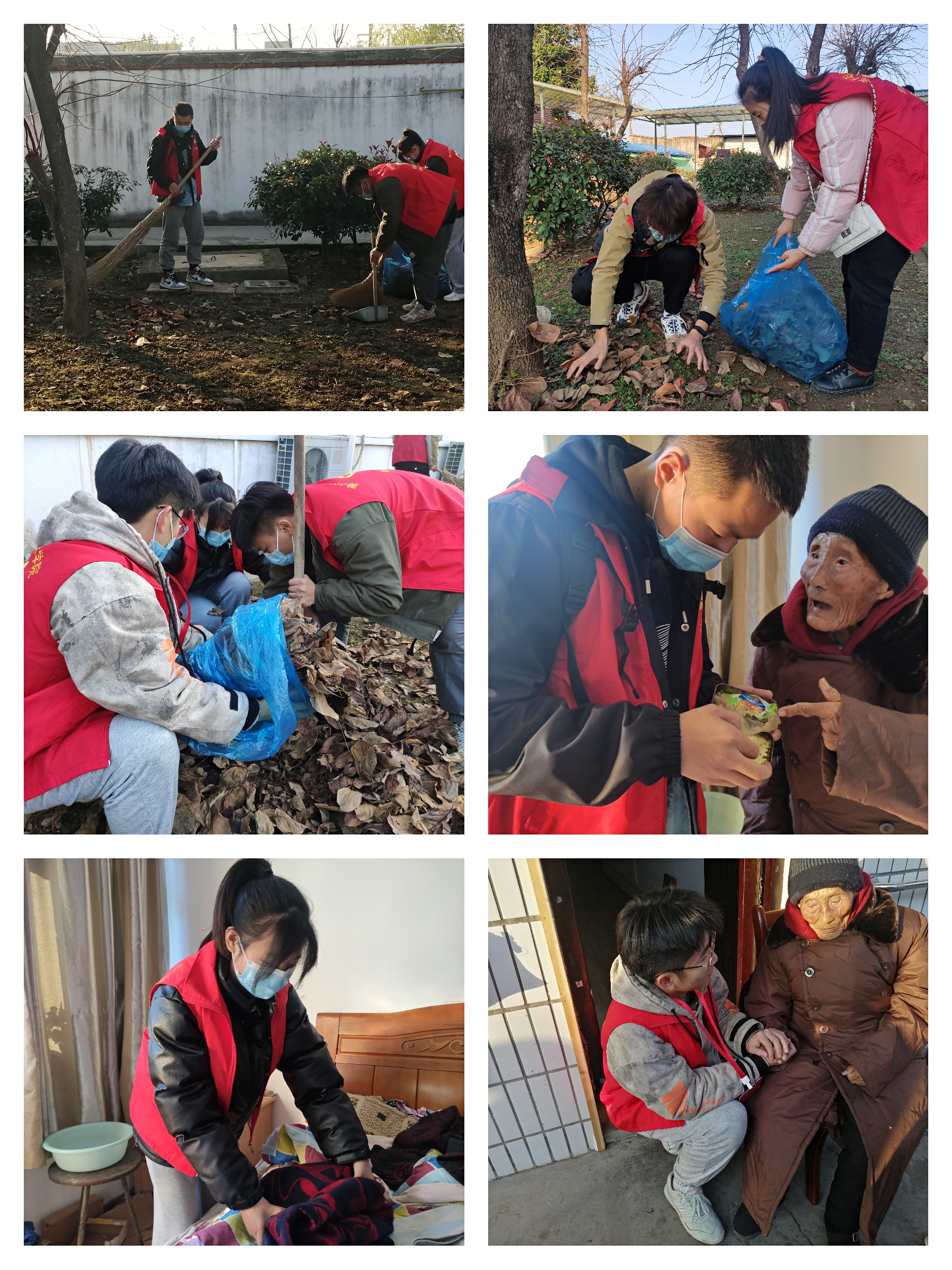 由于分工明确,同学们一到敬老院便开始动了起来。有的志愿者们拿着工具到达后院,把落在地上的枯叶全部清理打包;有的志愿者帮助打扫整理老人们的宿舍卫生、整理床单;有的给老人们按摩;有的陪老人们聊天、下象棋等。清理完卫生后,同学们立刻加入整理老人宿舍卫生和陪老人聊天的队伍,看到老人们脸上洋溢的笑容是这么灿烂,同学们也笑了,整个敬老院充满了他们的欢声笑语。临走之前,志愿者们的热情也受到了老人们和敬老院工作人员的高度赞扬。