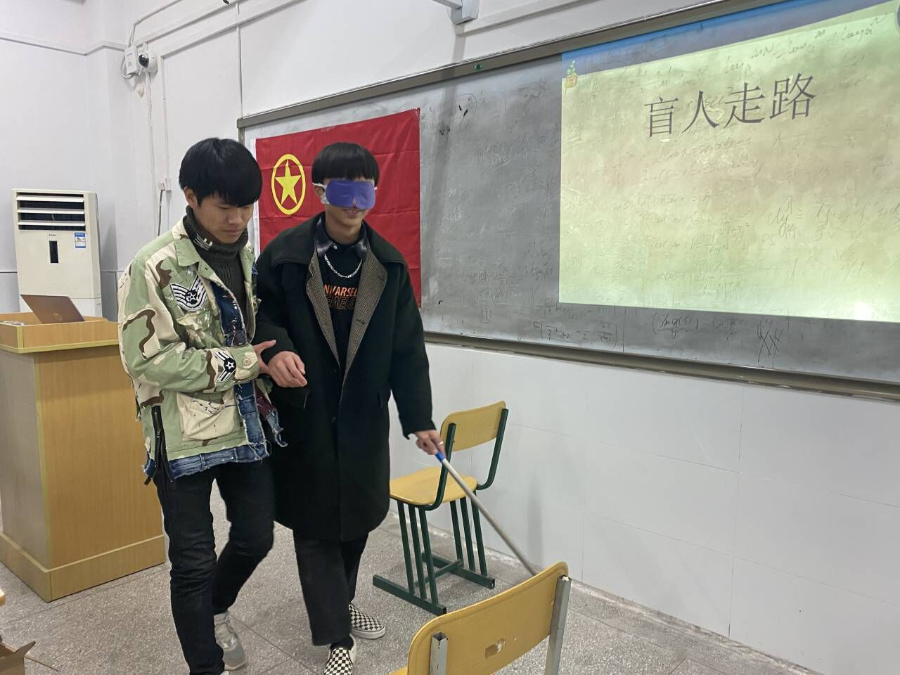 活动开始,由团支书郁明介绍一些关于残疾人日的相关知识,了解目前我国残疾人的现状,列举了残疾人身残志坚的励志感人事例,并由班级同学上台体验盲人的世界。亲身体验的环节让同学们了解到残疾人在生活中的不便,相信大家在以后的生活中遇到残疾人能够伸出自己的手热情相助。