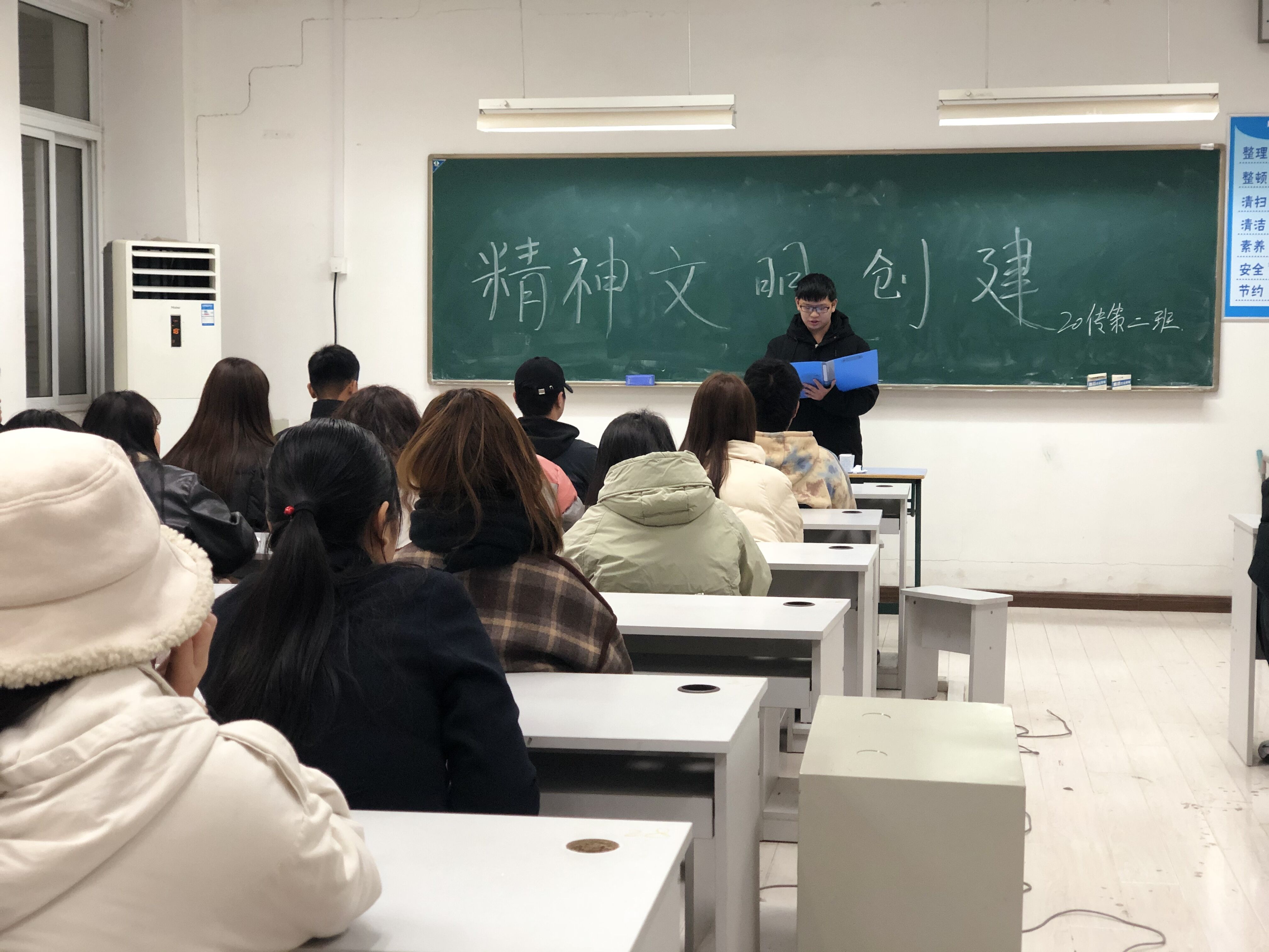 演讲开始,教室便齐齐坐满了人,由传媒与设计学院团组织生活部部长为大家贯彻社会主义精神文明的内容、作用及意义。抓好学院的社会主义精神文明的建设,提高学生的科学教育文化和思想教育文化。