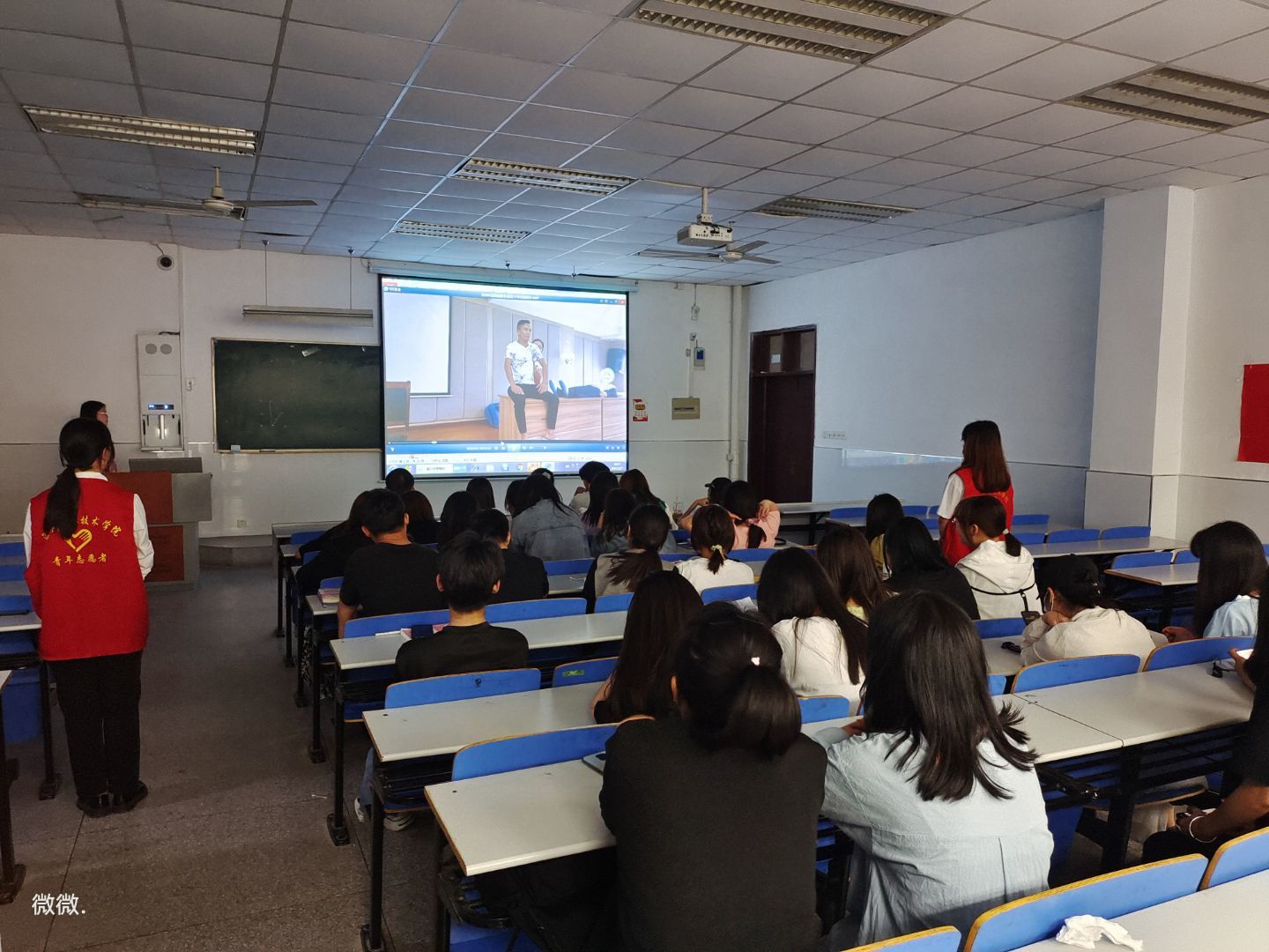 活动首先通过PPT和救护培训视频让同学们了解急救知识,然后开展了急救知识问答,最后让同学们亲自尝试了一下紧急救护,各自寻找搭档进行包扎和心肺复苏等急救技能。