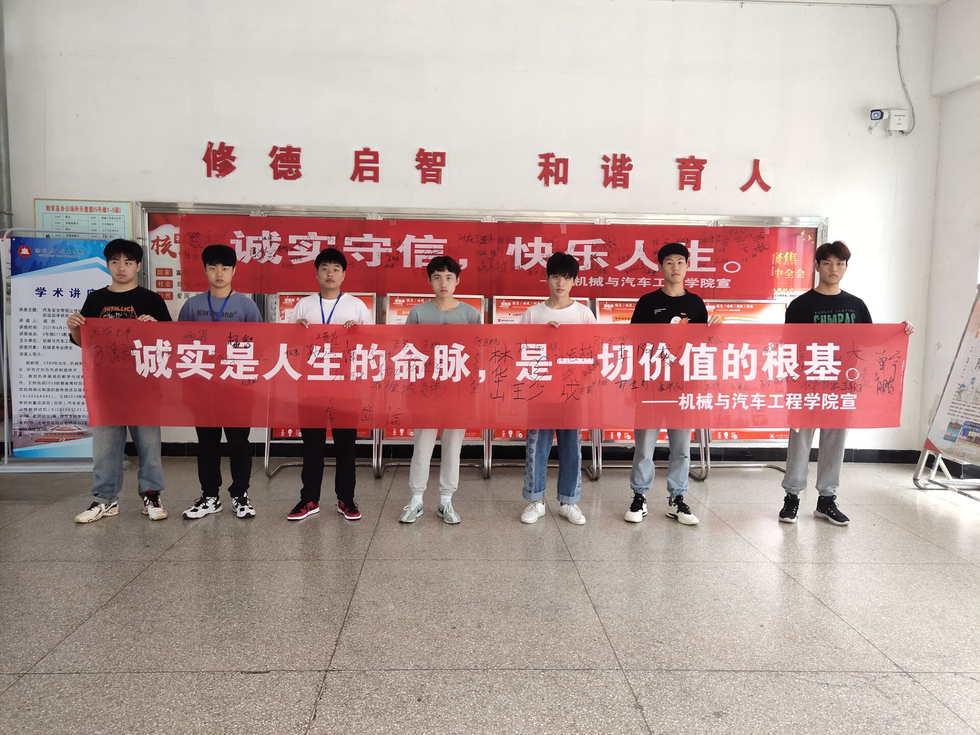 为弘扬诚信文化,培育同学们的诚实守信意识,2021年5月27日上午,机械与汽车工程学院学生会在5号楼教学楼一楼大厅开展“诚信教育”主题签名宣传活动,全院学生积极参与此次活动。