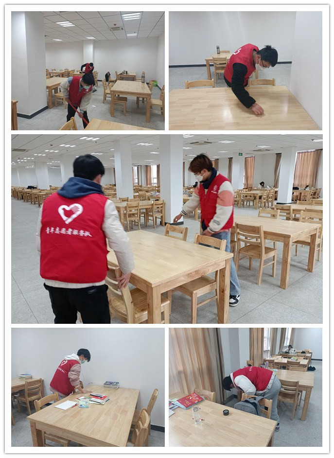 11名青年志愿者在图书馆老师的安排下,分配好志愿服务工作任务和区域,在不打扰他人学习的前提下开始志愿服务,桌面、地面、书柜都清理地一尘不染。经过志愿者们辛勤认真的打扫,自习室的每个角落和桌椅都变得干净整洁、焕然一新。