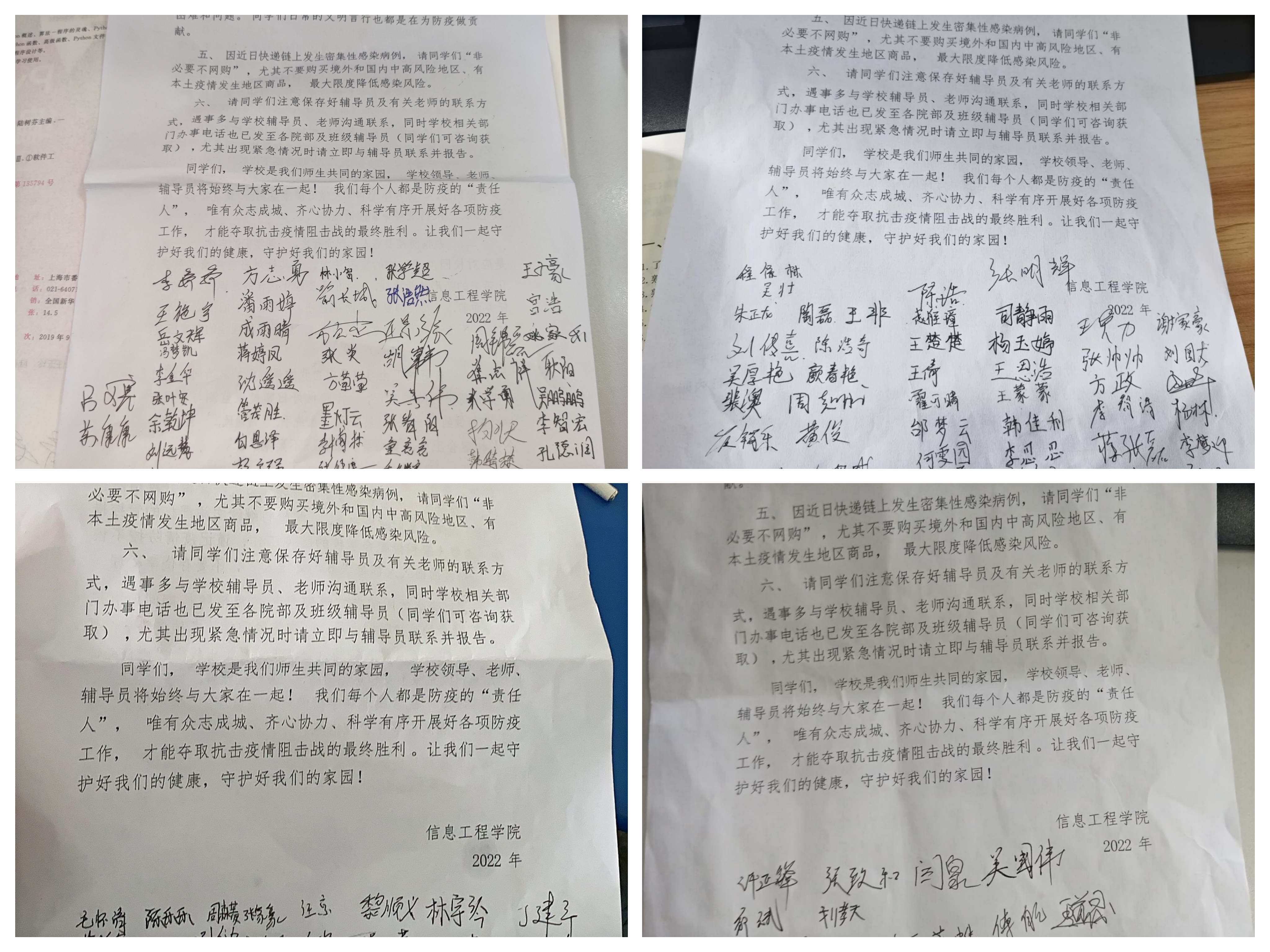 最后,通过PPT和视频短片的形式向同学们普及如何有效预防新型冠状病毒,包括科学合理的饮食、正确的佩戴口罩和保持手部清洁等,呼吁同学们加强疫情防控意识,严格遵守学校的疫情防控措施,提高防控能力,用科学健康的防疫知识武装自己,携手同行,共克时艰,打赢这场疫情防控攻坚战。同时,我院以支部为单位签署了疫情告知书,确保每位学生知疫情,重防控。