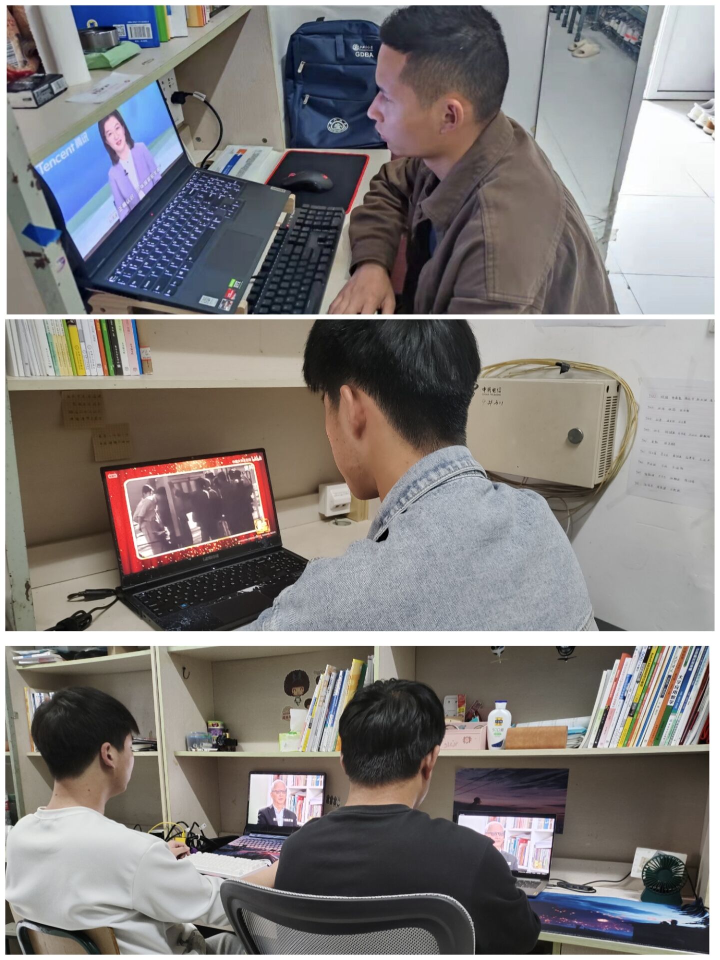 各班级按照学校疫情防控工作要求,实施错峰观看学习。组织师生在班级和寝室共同收看,确保学习质量和效果,安全防护落实到位。