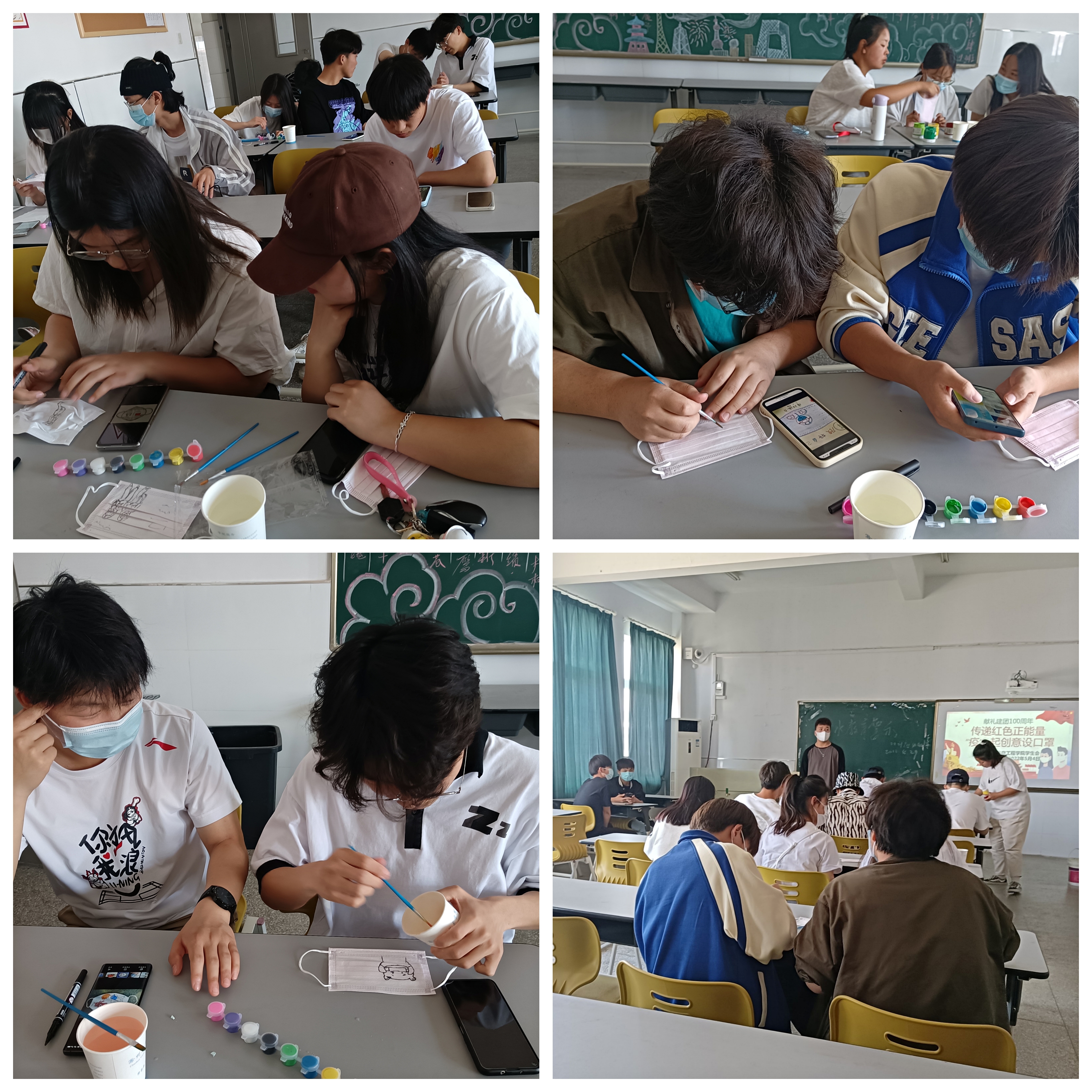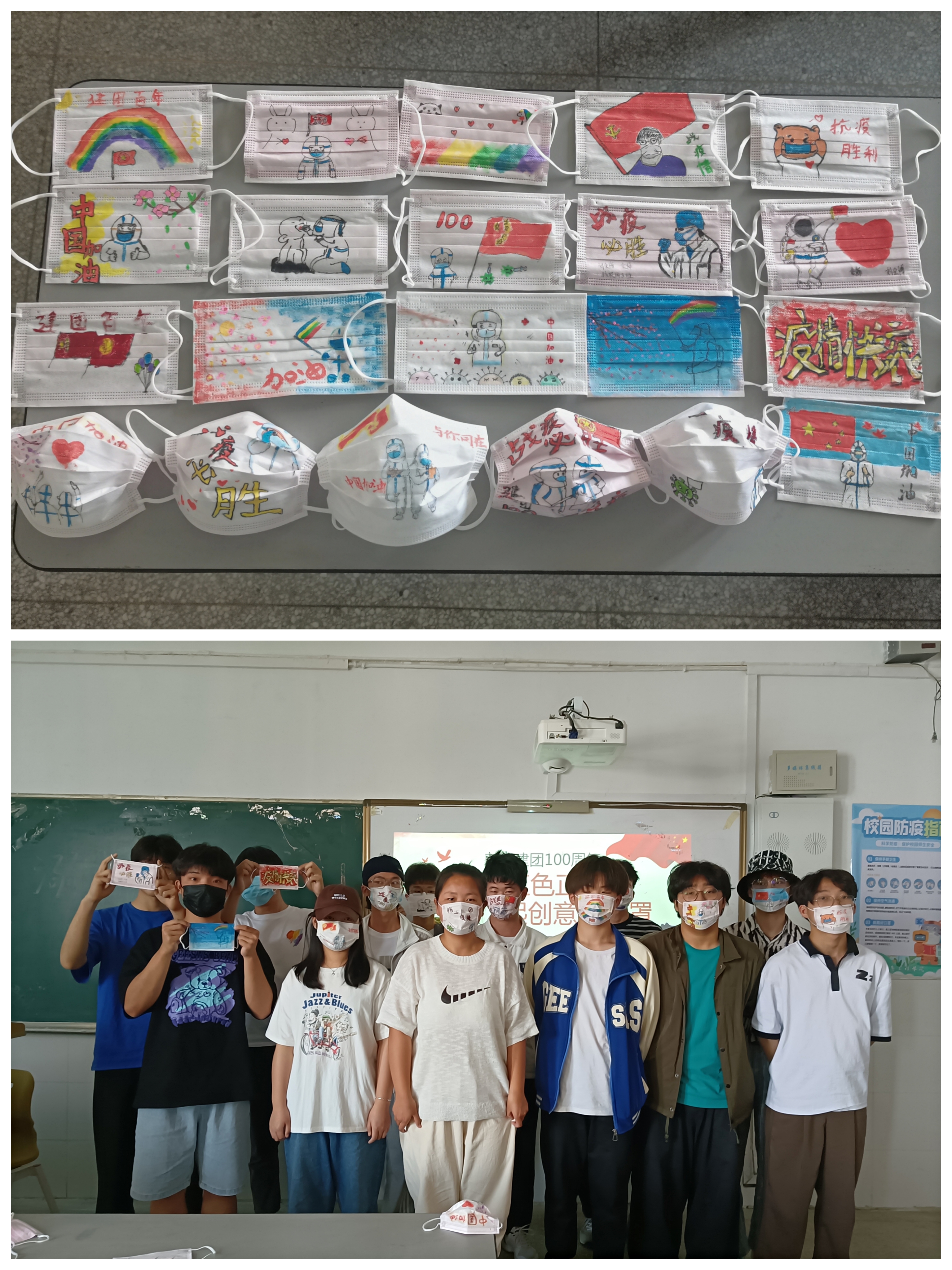 同学们踊跃参与,利用有限的材料,作品内容紧密围绕活动主题。有的同学以共青团成立100周年为主题,展示了中国共青团成立一百周年的光辉历史。有的同学以疫情防控为主题,展现了疫情期间逆行者的身影等。有的同学把二者相结合。同学们尽显其才,设计了创意满分的口罩,展示了我院学子积极向上的青春风貌。