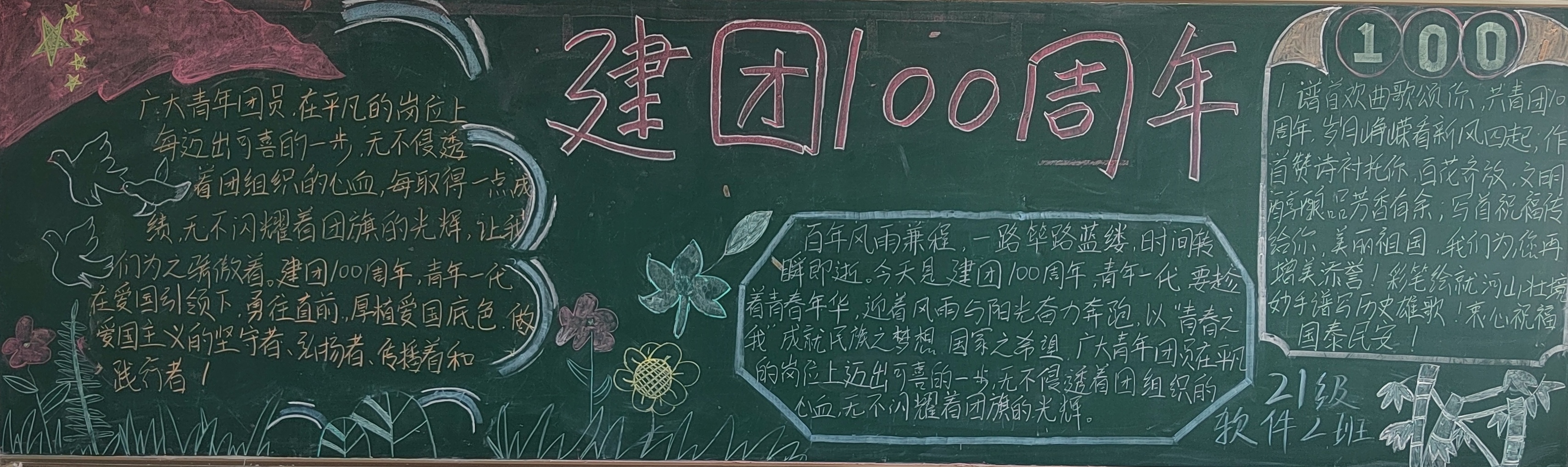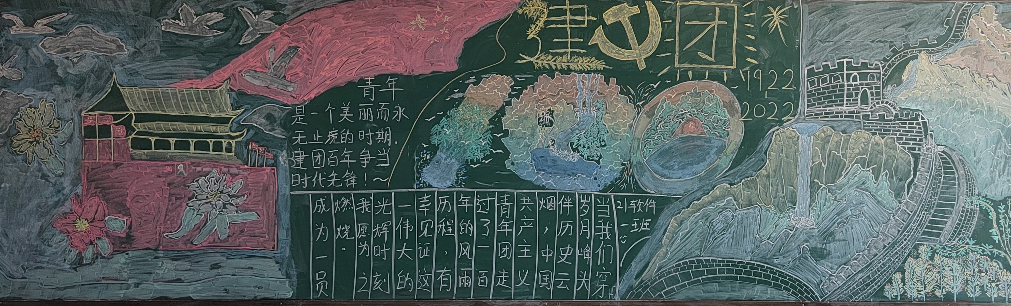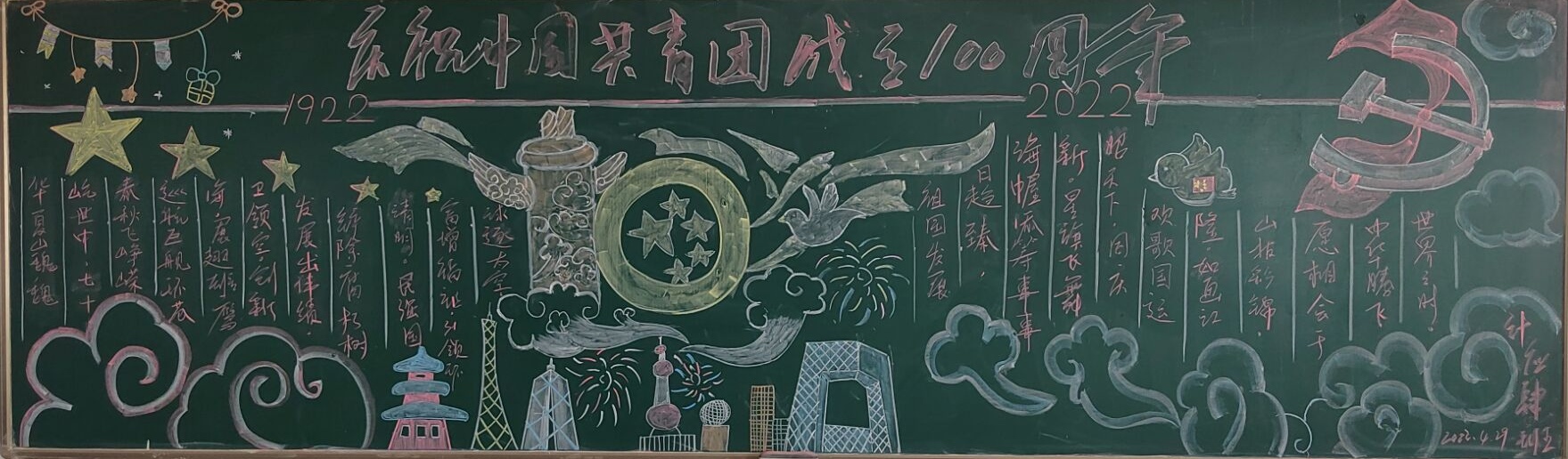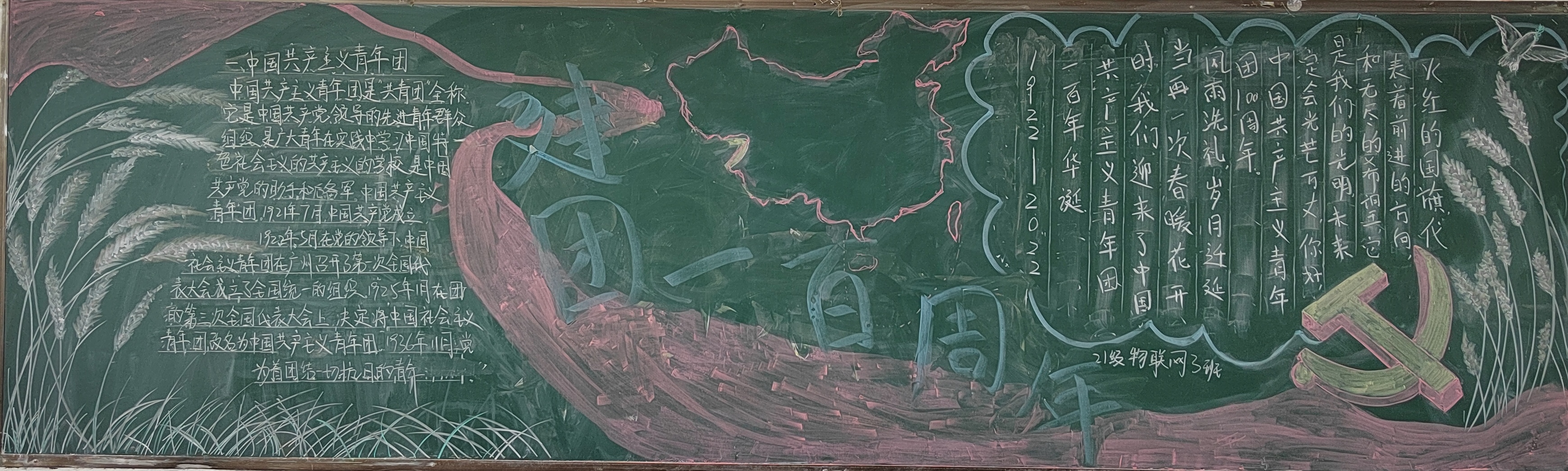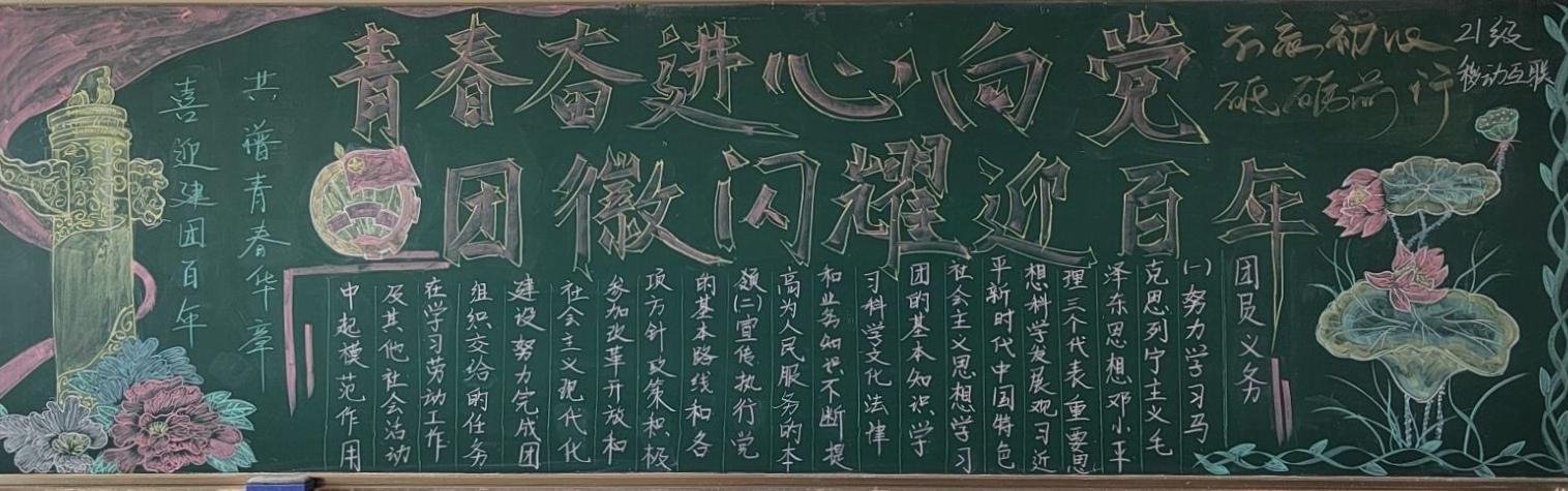 为庆祝中国共产主义青年团成立100周年,深化我院青年学生对共青团悠久历史和光荣传统的认识理解。5月4日下午,信息工程学院学生会开展了以“共青团成立一百周年绽芳华 共绘蓝图迎盛世”为主题的黑板报评比活动,带领团员青年重温百年团史,传承红色基因。