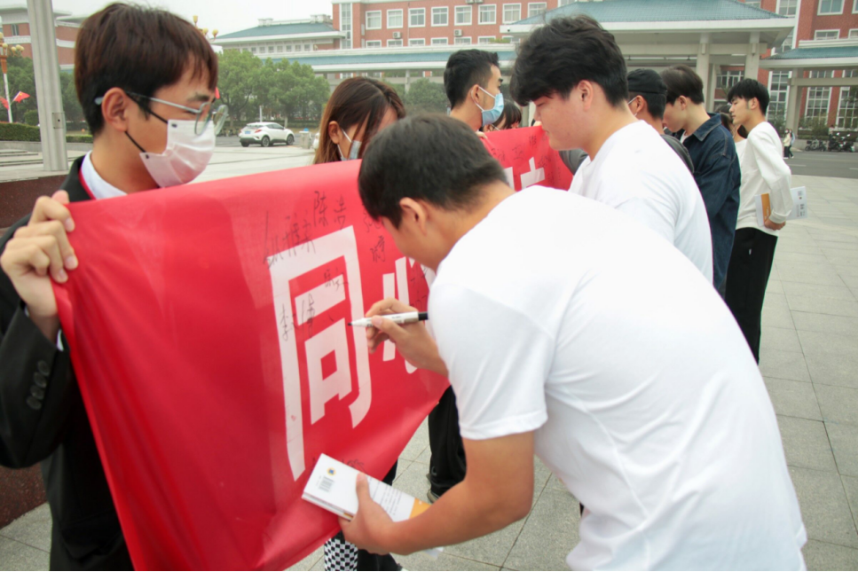 早晨7点,升旗仪式正式开始。随着“齐步走”的口令声,国旗护卫队的同学们迈着铿锵有力的步伐,昂首挺胸、英姿勃发地走向升旗台。伴随着雄壮激昂的《义勇军进行曲》,五星红旗冉冉升起,随风飘扬。全体师生肃立行注目礼。活动最后商学院学生代表在横幅上签字留念。