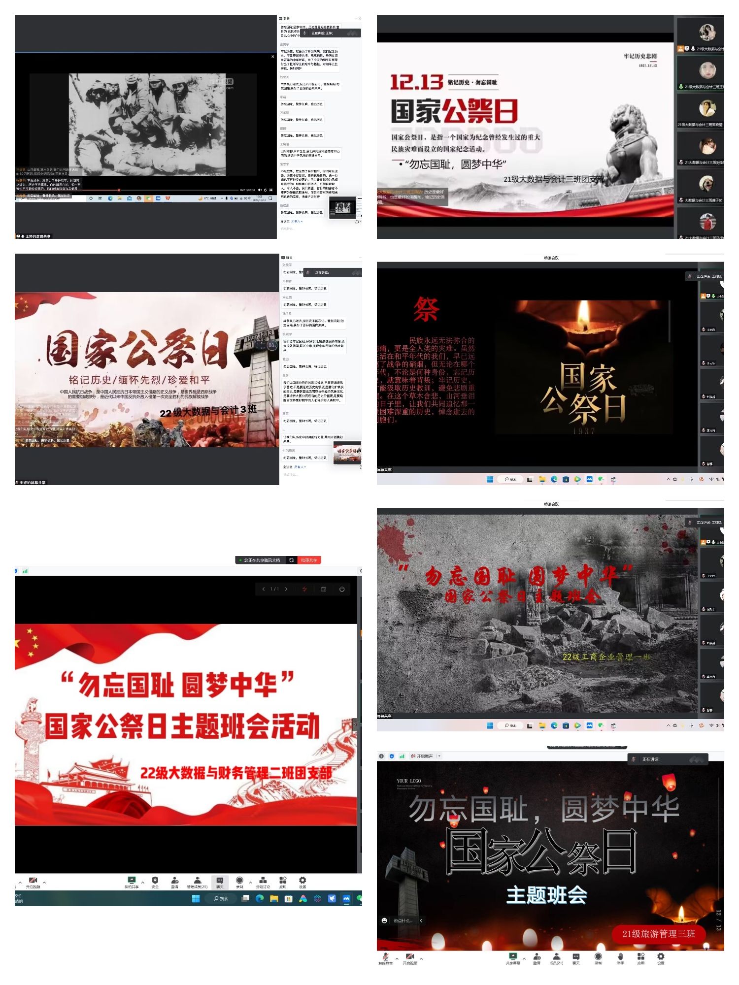 为了让昭昭历史永存人间,提醒吾辈自立自强。管理学院团总支于12月13日18:00组织各班团支书在腾讯会议上开展“勿忘国耻,园梦中华”主题活动,21、22级全体同学参加。