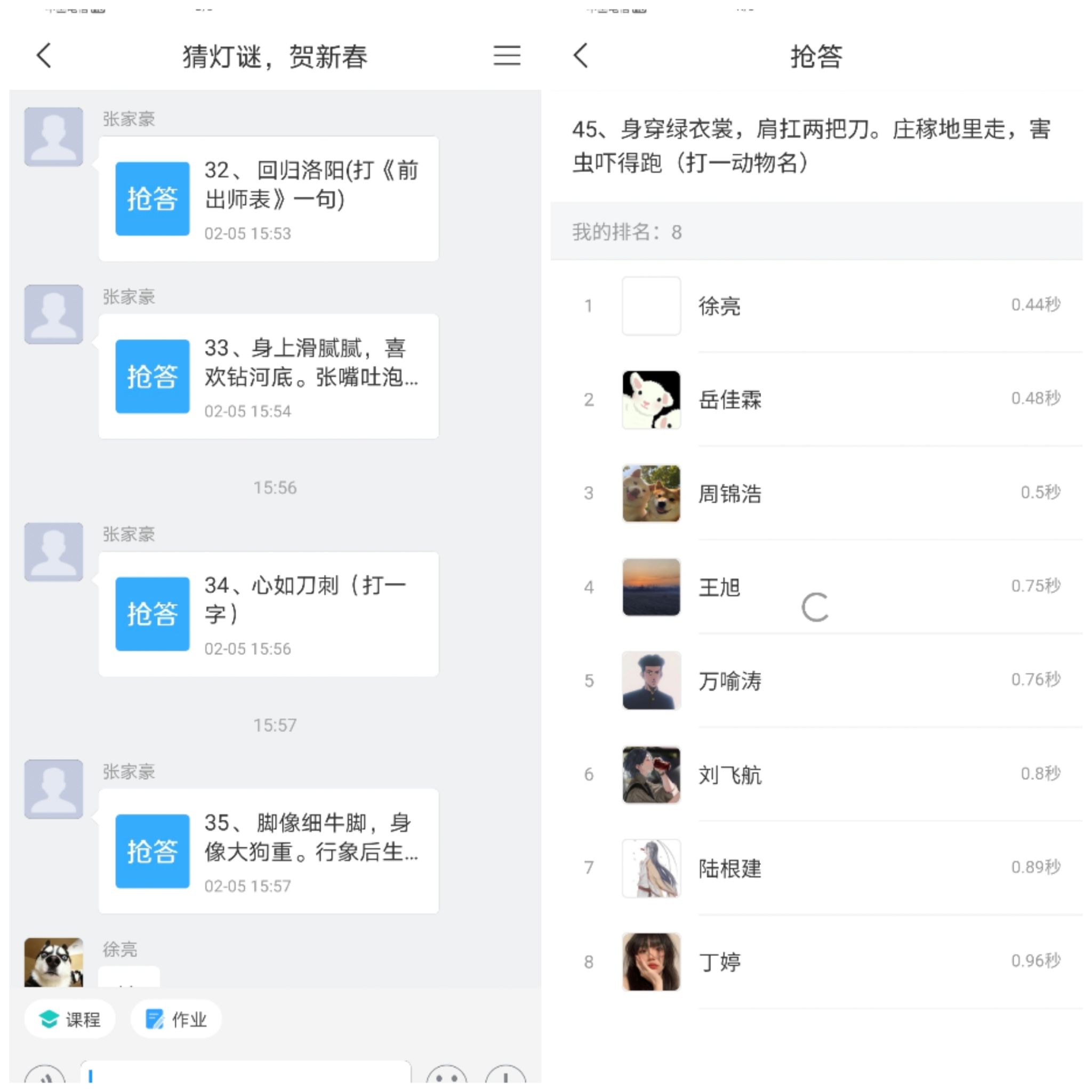 活动中,主持人张家豪给同学们介绍了元宵节的起源与传统习俗,同学们积极互动交流。接下来的猜灯谜环节更是将活动推向高潮,谜面则以元宵主题的成语迷、数字迷、猜字谜等内容为主,同学们在个个争先恐后,积极抢答思考,共同探讨,在群里你一言我一语,讨论谜语的答案,群里洋溢着温馨热闹的节日气息。