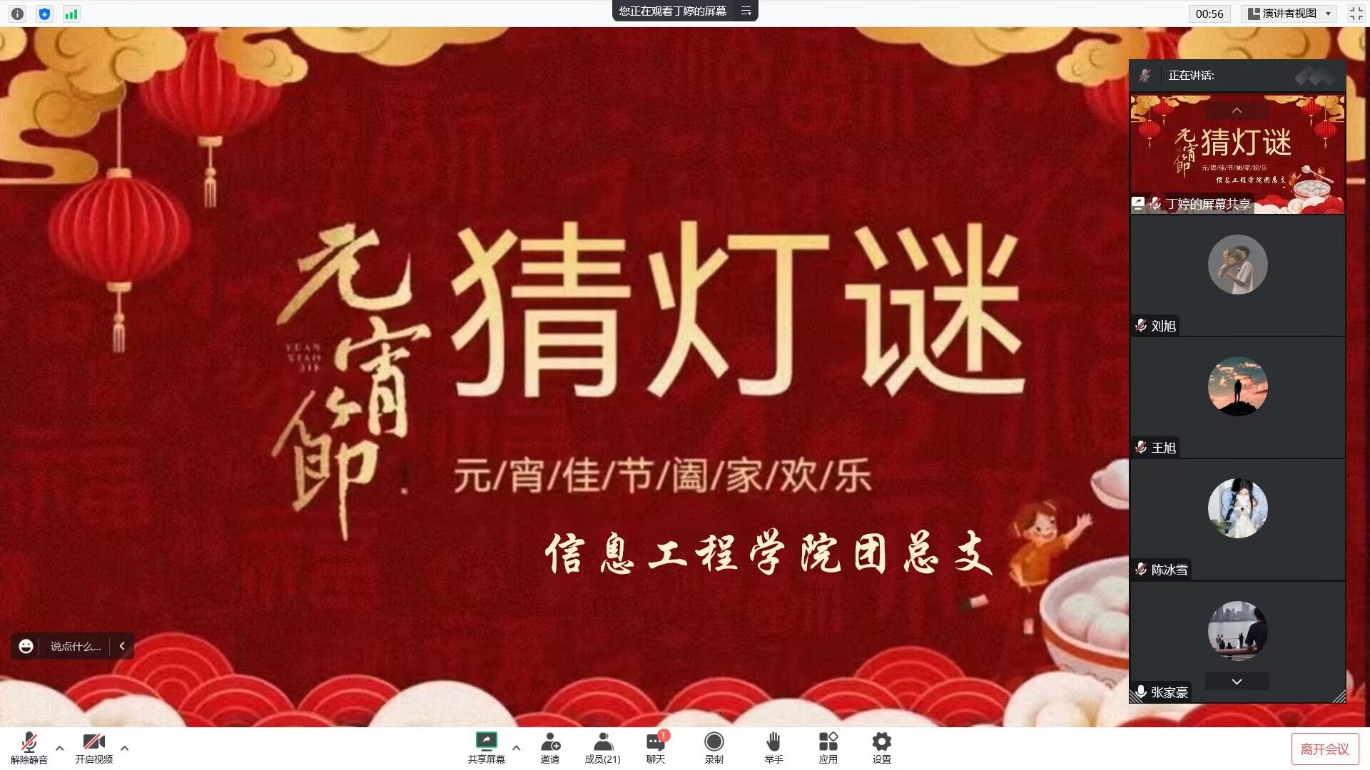 农历正月十五是元宵节,为弘扬中华优秀传统文化,传承节日习俗。2月5日,信息工程学院团总支组织部分学生代表线上开展了元宵节线上猜灯谜主题活动。
