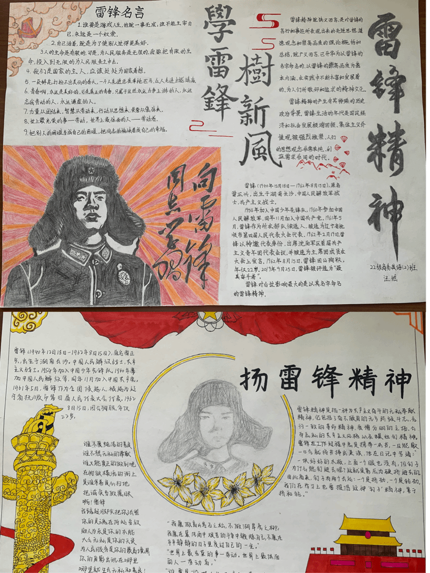 为进一步引导和激励同学们弘扬雷锋精神,赋予雷锋精神新时代的内涵,营造浓厚的学雷锋氛围,商学院团总支于3月12日开展了“扬雷锋精神,传青春正能量”主题手抄报活动。