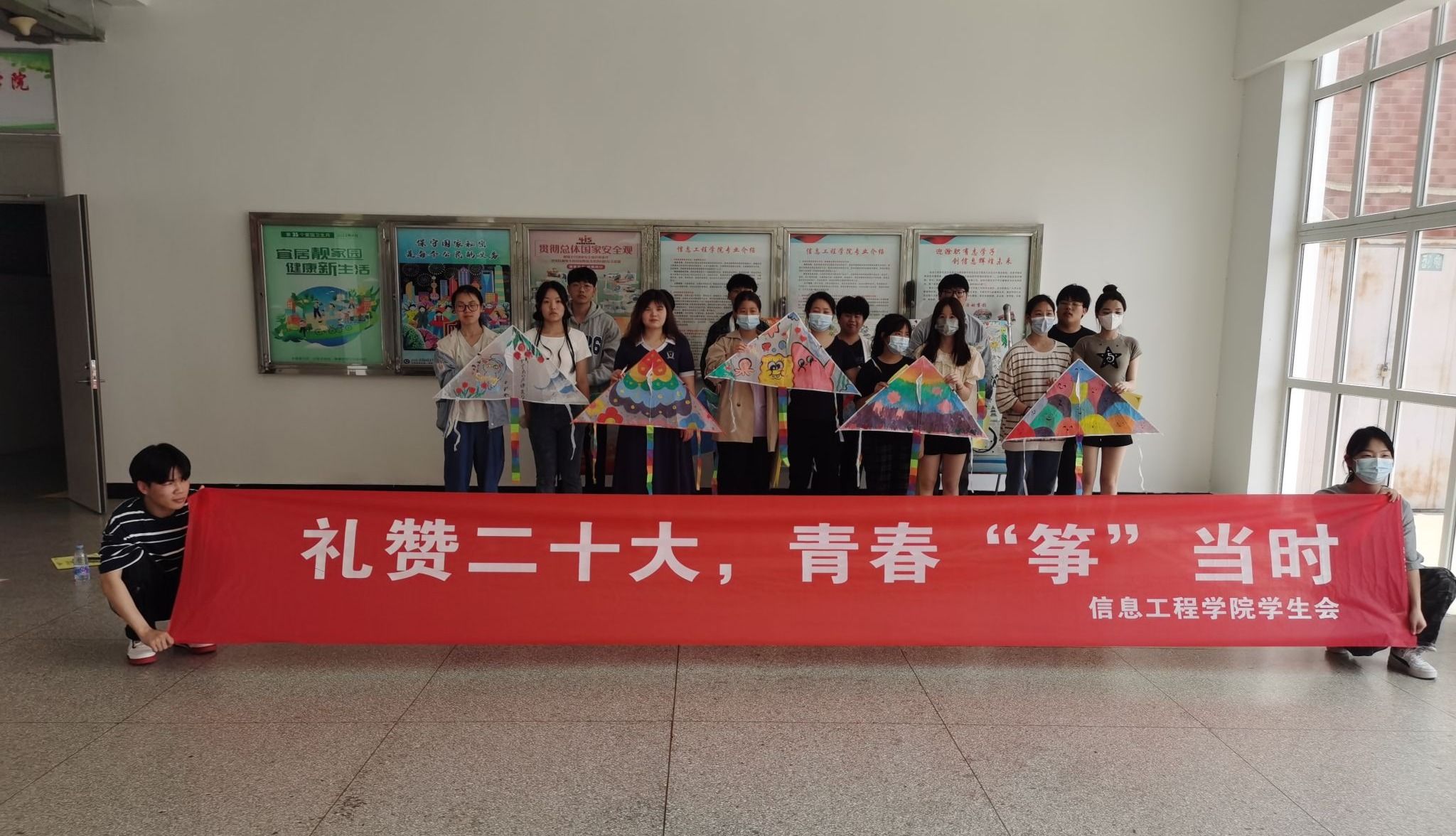为进一步营造学习宣传贯彻党的二十大精神的浓厚氛围,丰富同学们的校园课余文化生活,培养实践创新能力。4月16日,信息工程学院学生会联合管理学院、传媒学院、交通运输学院等学生会在1101开展了“礼赞二十大,青春‘筝’当时”风筝节活动。