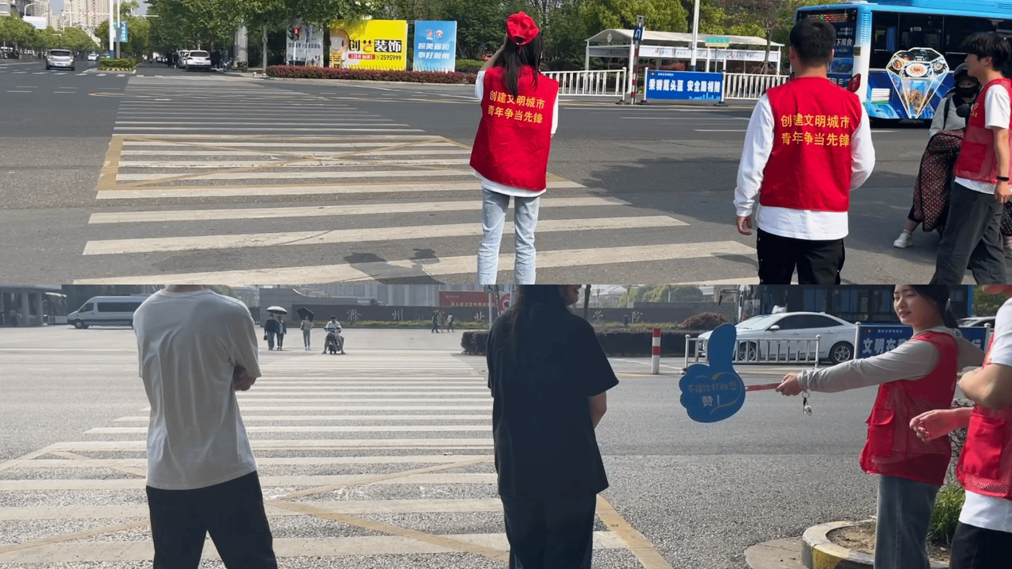 活动中,同学们在22人工智能4班团支书汝文鑫的带领下分成三个小组身穿红色志愿马甲、手持劝导牌站在多个交通路口,防止有乱穿马路,闯红灯等不文明行为出现,活动中志愿者们对不文明行为进行文明劝导,在志愿者的引导下交通秩序变得更加美好。