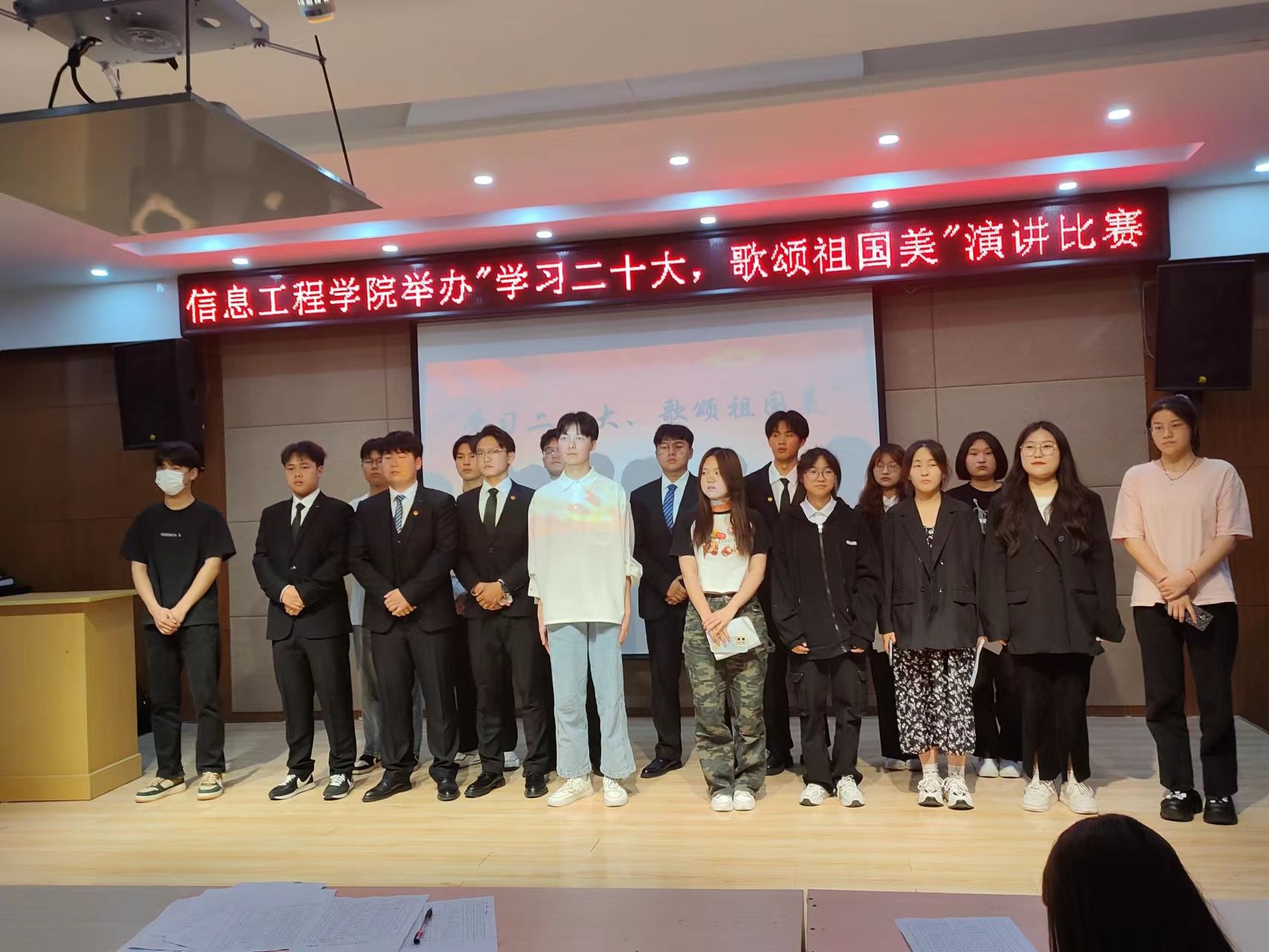 为深入学习宣传贯彻党的二十大精神, 激发同学们的爱国热情。5月17日,信息工程学院在南阶203开展了第二十届校园文化艺术节之“学习二十大,歌颂祖国美”主题演讲比赛。