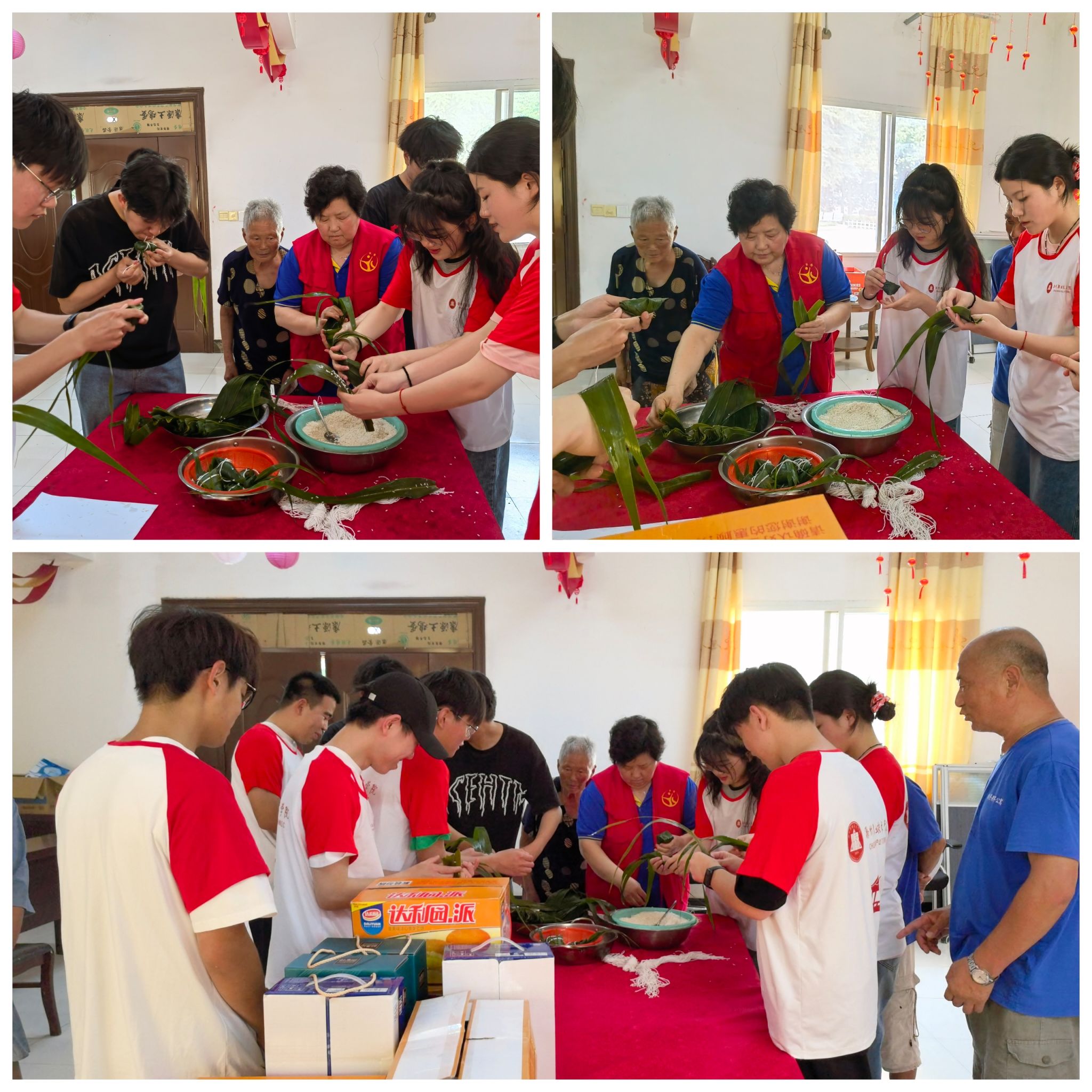 活动期间,实践团成员在养老院工作人员的指导下把带去的粽叶、和糯米包成一个个粽子。因天气和老人身体原因,同学们把带去的面包、牛奶等走进老人们的房间亲自送到老人们手中。同时,与老人们亲切交谈,仔细询问了老人们的生活起居、身体健康等生活情况,倾听老人的心声,了解他们的需求,并向老人们送上节日祝福。