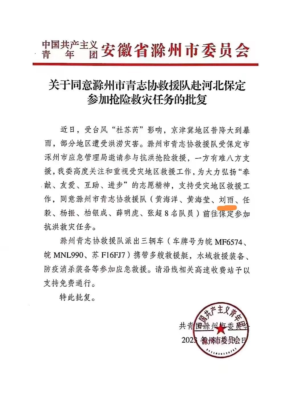刘雨现为滁州市青志协救援队的一员,同时也是一名退役士兵。8月2日晚,他主动请缨加入救援队伍,前往河北涿州参与抗洪救援行动。在结束完两天两夜的抗洪救灾后,他又和其队员转战黑龙江省牡丹江市继续参加抗洪救灾。8月9日,刘雨和其队友们安全返滁,圆满完成抗洪救灾任务。灾情就是命令,刘雨同学用实际行动彰显了当代退役大学生的赤胆忠心。