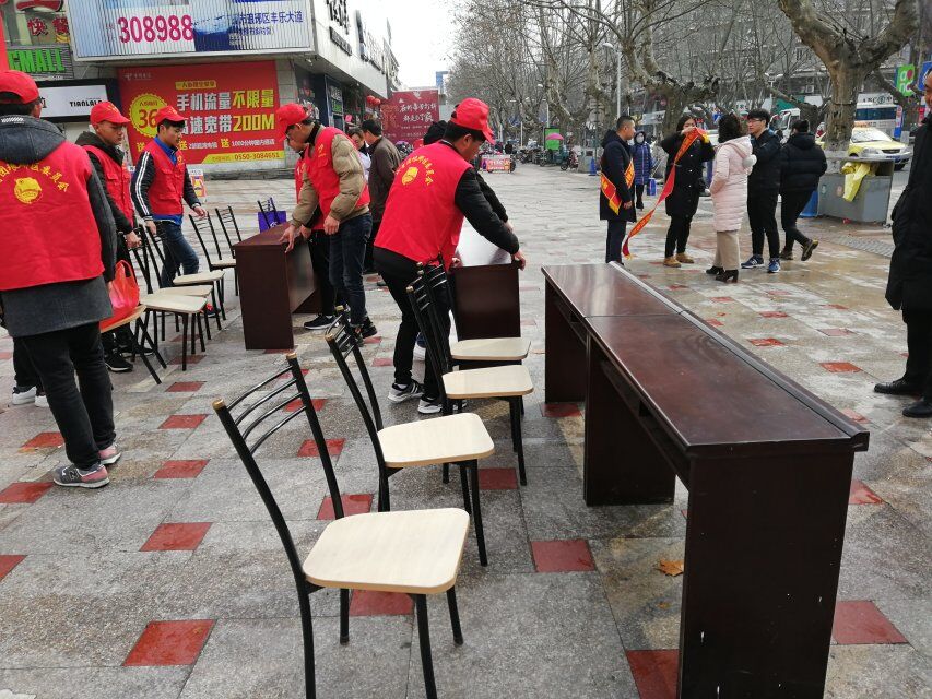 活动开始前志愿者们就积极的布置活动会场,搬凳子、抬桌子。活动开始后,由学生会主席张炎带着一部分志愿者对路人发放健康手册传单,并带着一部分志愿者拿着铲子桶布到五金巷里面铲小广告。在活动中有不少路人也积极参加了我们志愿者的队伍中。